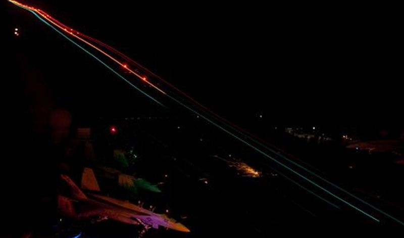 I am pretty sure it is the AoA indexer on the nose gear. I have picture I took from vultures row, and you could clearly see the AoA indexer when the jet was in the landing attitude (see attached pic). With a long exposure you would get the affect in the picture Orion posted. I've seen similar pics of night approaches with AoA shown and discussed. That is were I got the idea for vLSO that I suggested to Serge.