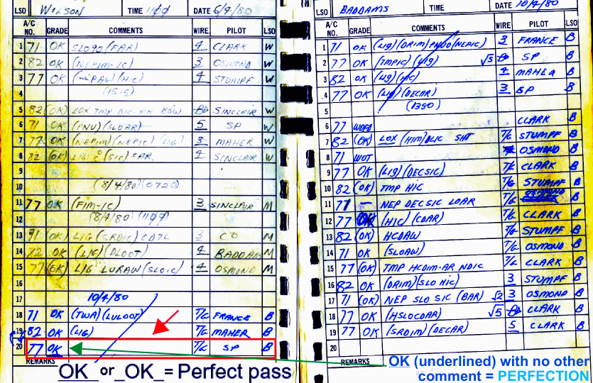 Back in the olden days (1980) April when I think VF-805 were flying A4Gs in RIMPAC 1980 aboard HMAS Melbourne the SP (Senior Pilot = XO) himself an LSO (the first jet LSO in the RAN since the prop days of yore - no LSOs in Sea Venom era) was able to snag a perfect OK pass underlined no comments. BTW 'Stumpf' is LEUT Bob Stumpf USN on exchange, who went on to be a Blue Angels Leader later in the Hornet era [led the team from November 1992 to November 1994]. Top of page on left he gets an OK 4 wire (target). Old Stumpf PBS interview transcript here: http://www.pbs.org/wgbh/pages/frontline/shows/navy/oldnew/stumpf2.html