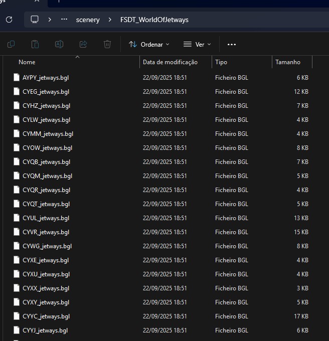 Should contain only ONE single .BGL named FSDT_WorldOfJetways_Lib.BGL, if you have the other .bgl with the ICAO codes, that's wrong and they are supposed to be removed by the installer, because they are now located here: