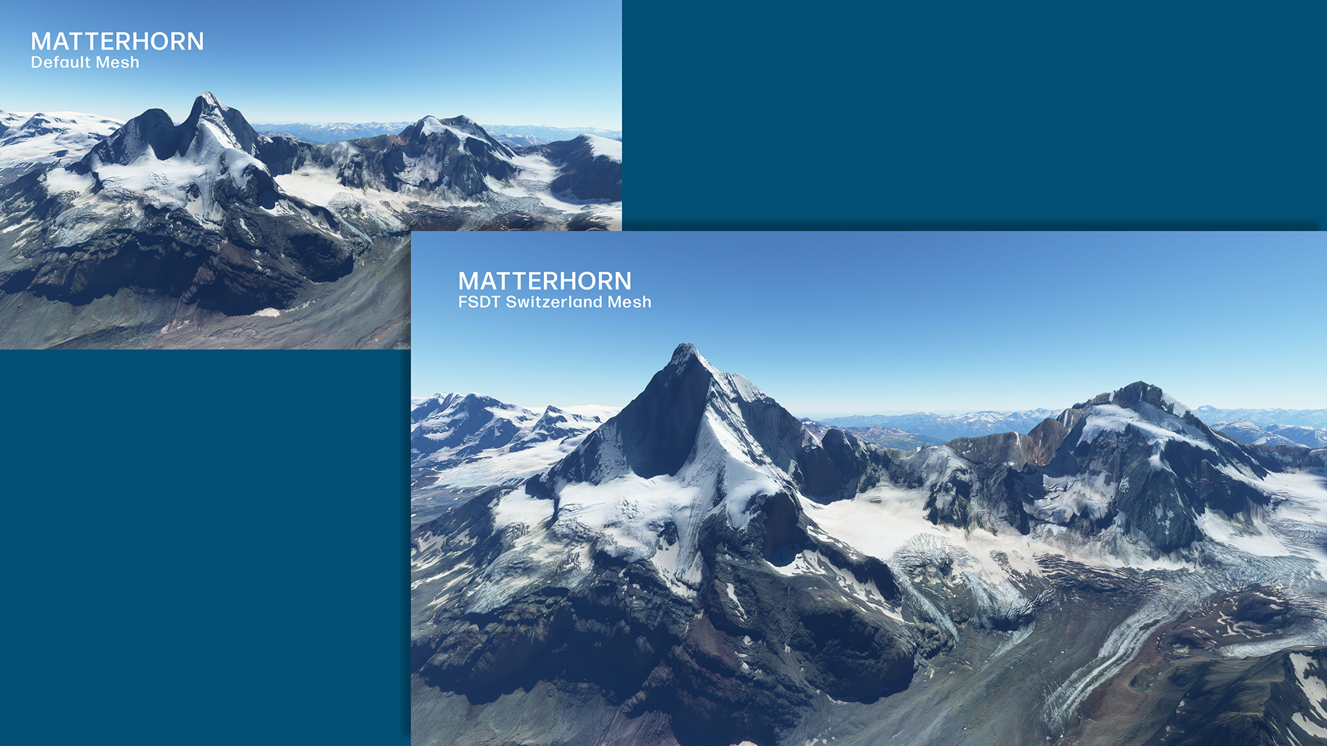 High quality mesh for the whole country of Switzerland, derived from original 1m resolution elevation data from the Federal Office of Topography ( Swisstopo ), resampled in 10m and 20m meters for the best performances. The mesh has been carefully made to not cover any airports, to prevent possible compatibility problems with default or 3rd party airports. A set of hundreds of Landmark POIs to mark Peaks, Valleys and Dams is included.