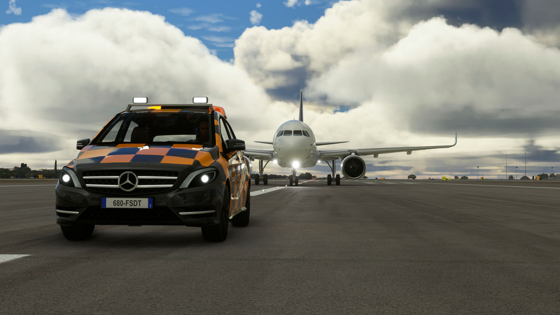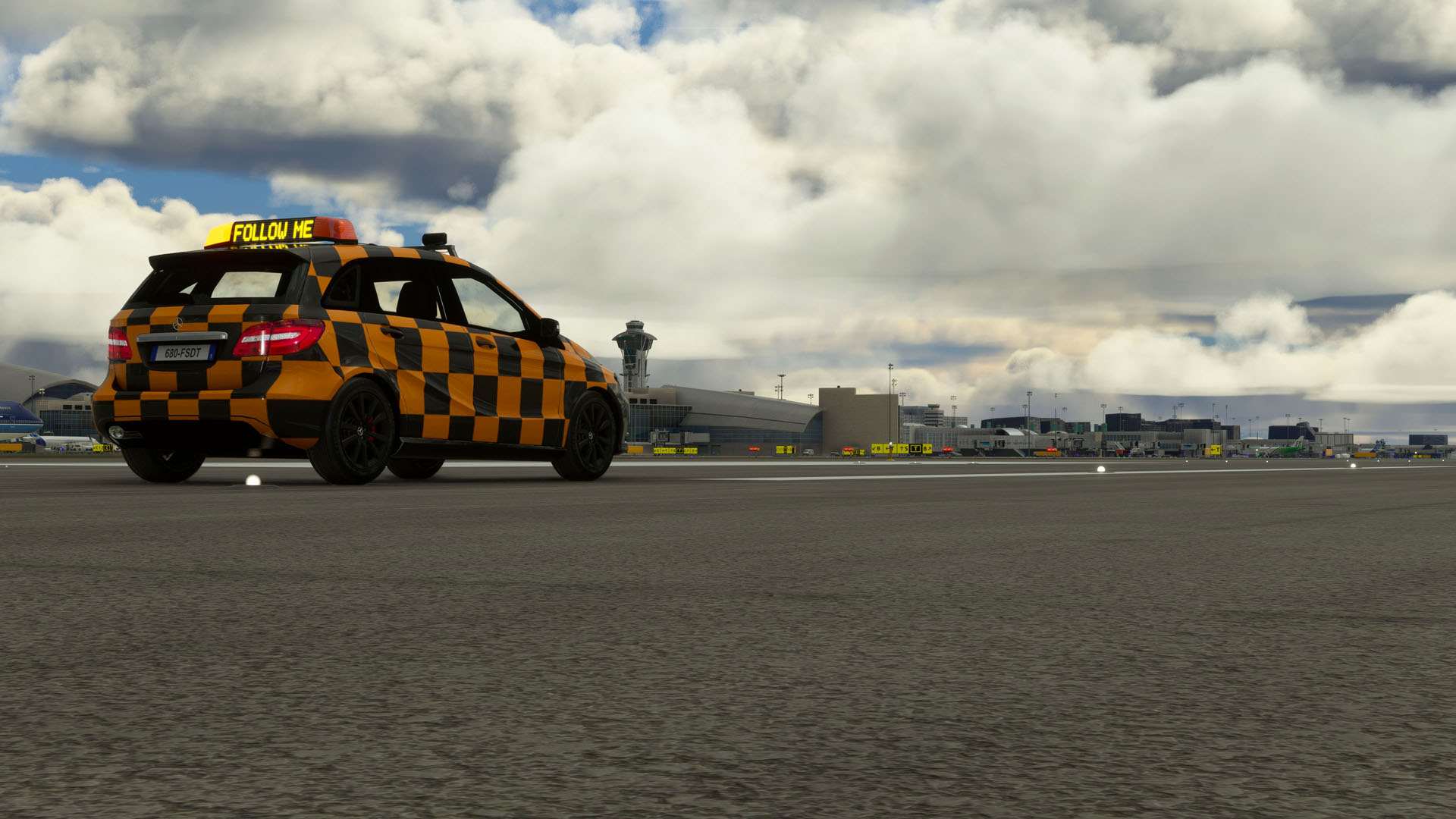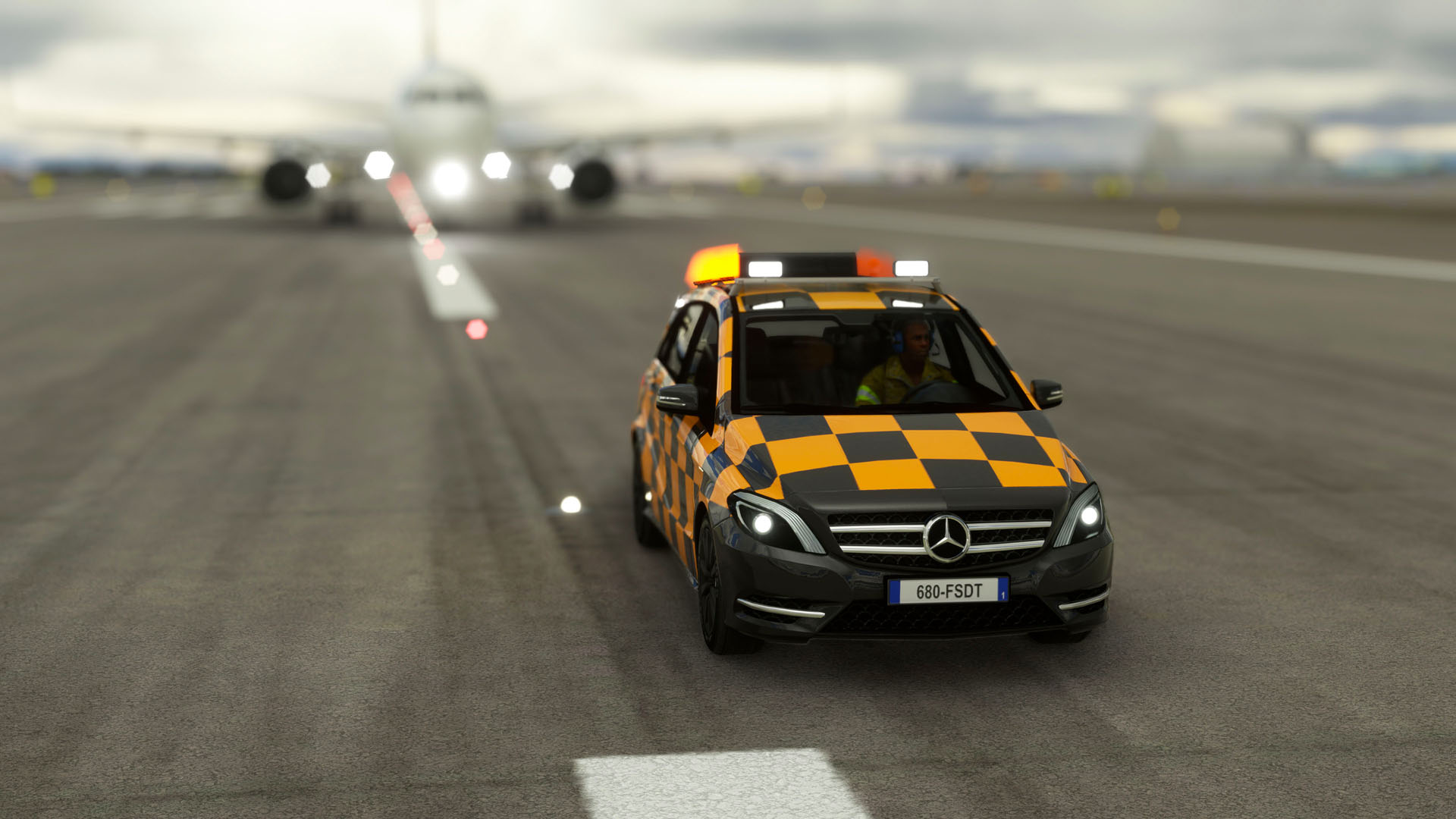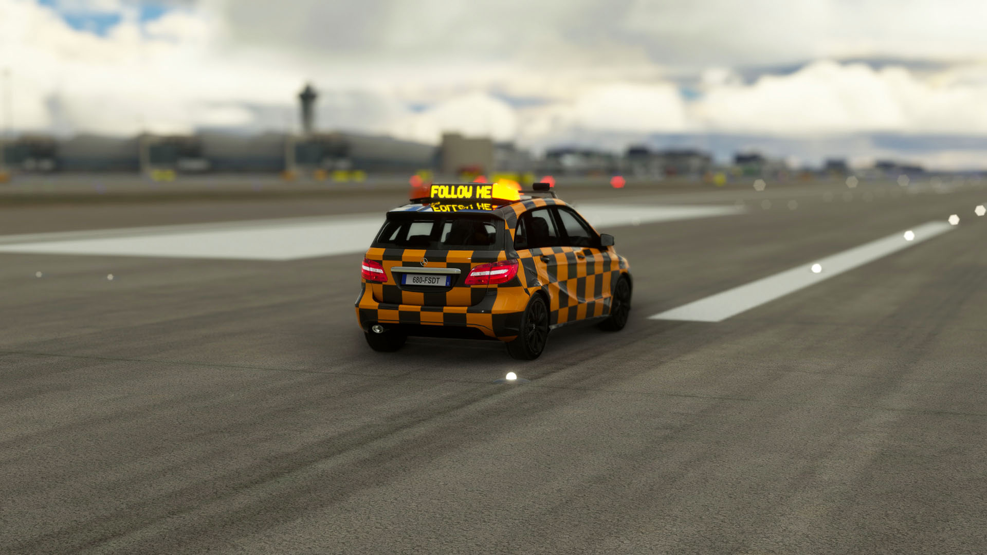 Professional marshalling with illuminated wands for night operations, realistic hand signals based on ICAO standards, and Follow-Me cars for runway and gate guidance. Features custom speed control and automatic route calculation to any parking position or runway.