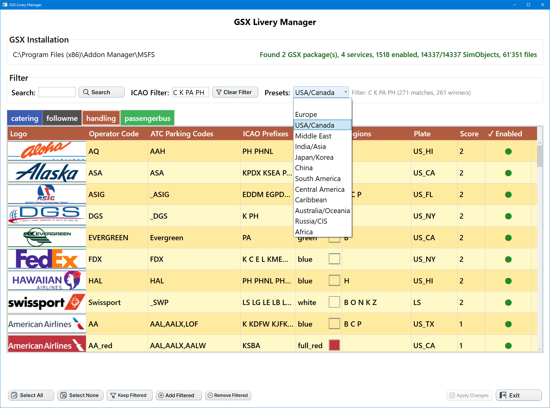 Essential utility for optimizing GSX Pro's performance by managing the installed operator liveries. The primary purpose is to create a reduced, customized set of operators for the regions you fly most frequently, significantly decreasing the number of SimObjects loaded in the simulator. This optimization directly improves MSFS startup times and reduces memory usage. Features include: