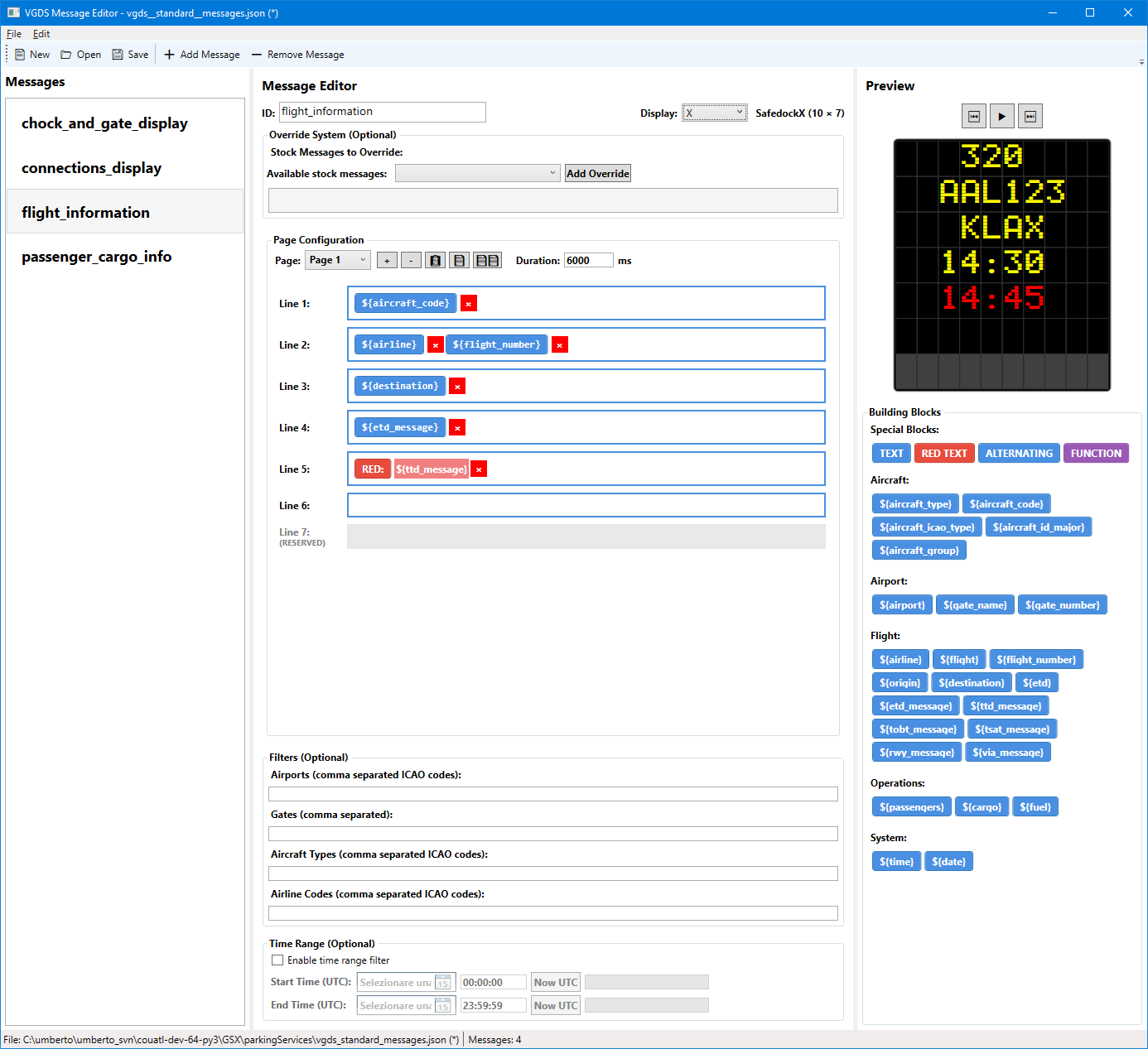 Create and customize messages displayed on Visual Docking Guidance Systems. Design multi-page message sequences with dynamic content including flight information, airline branding, operational announcements, weather alerts, and seasonal greetings. Features include: